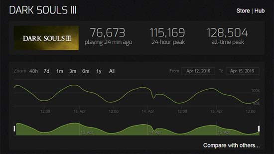 Релиз Dark Souls 3 состоялся 12 апреля. Пик активности геймеров пришелся на ночь с 12 на 13 апреля. В настоящий момент максимальное количество игроков онлайн достигает отметки в 115 тысяч. Пока этого достаточно, чтобы игра удержалась на третьей строчки чарта.