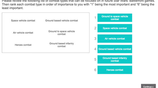 В одном из вопросов исследования геймеров просят расставить различные виды боев в порядке привлекательности по мнению респондентов. Среди них числятся бои между героями, наземные сражения с участием техники и пехоты, а также космические сражения и сражения между космическими и наземными видами военной техники.