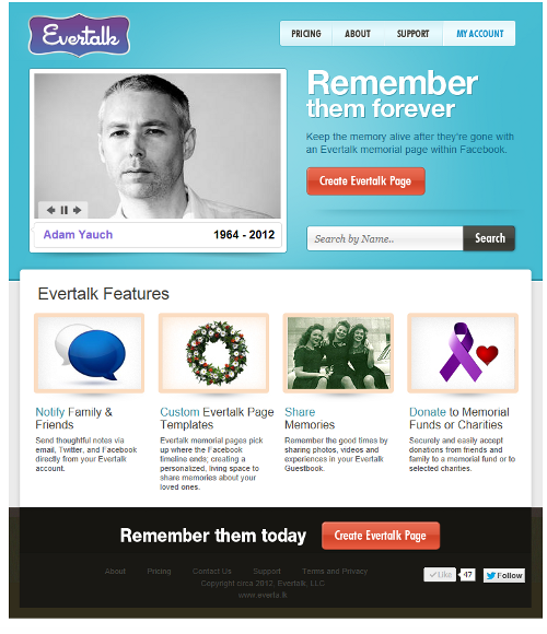Используя функционал Facebook, приложение Evertalk позволяет пользователям, потерявшим своих близких, создавать фото- и видеостраницы, а также гостевую книгу. К тому же, Evertalk включает опцию для создания страницы пожертвований.