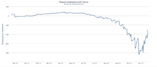 С другой стороны, трудоемкость производства криптовалюты со времнем лишь увеличивается, и преимущество получают люди, имеющие доступ к достаточным вычислительным мощностям (напомним, что эмиссия новых биткоинов завязана на подтверждении транзакций – чтобы получить новые монеты, придется заниматься майнингом и выполнять объемные компьютерные вычисления). У вас нет специального генератора CoinTerra? Можете забыть о биткоинах. Обычные пользователи оказываются выдавлены из массового производства криптовалюты, потому что при нынешнем уровне цен это оказывается просто невыгодным (см. график).