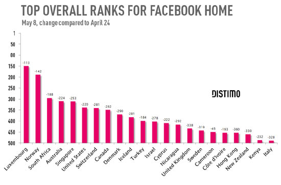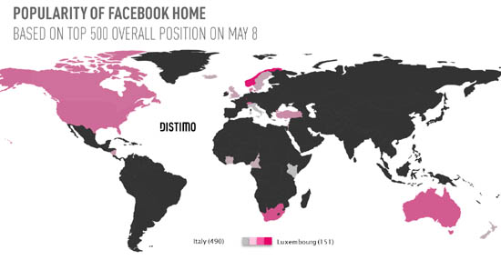 По данным аналитической компании Distimo, единственной страной, где к началу мая Facebook Home оставался в 150 самых популярных эппов Google Play, оказался крошечный Люксембург. На самых же крупных рынках – в США, Великобритании, Канаде – Home в данный момент не входит даже в топ-500. И позиции приложения стремительно ухудшаются.