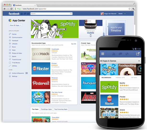Компания Facebook только что запустила свой центр приложений (App Center). Это каталог приложений, которые используют социальную графу Facebook как в веб, так и в мобильных девайсах.