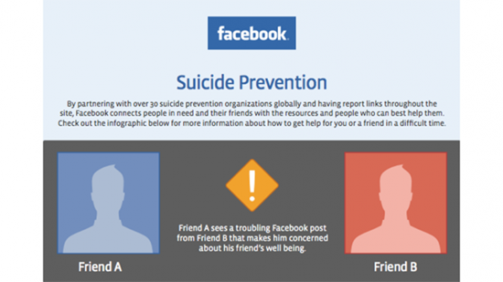 Сентябрь 2013 года был объявлен месяцем предотвращения самоубийств, и в его рамках Facebook поместит публичные объявления для пользователей в Канаде, США и Великобритании, которые будут состоять из инфографики, показывающей, как помочь другому человеку, который решил расстаться с жизнью.