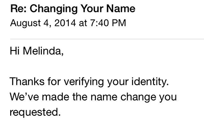 Мелинда Кисс, живущая на Лонг-Айленде, 6 июня вышла замуж за своего возлюбленного Боба Флекера (Bob Flecker). Вернувшись из медового месяца, девушка наконец-то решила отразить изменения в своей жизни на Facebook. Она зашла на сайт и попыталась обновить своё имя на Мелинда Кисс Флекер.