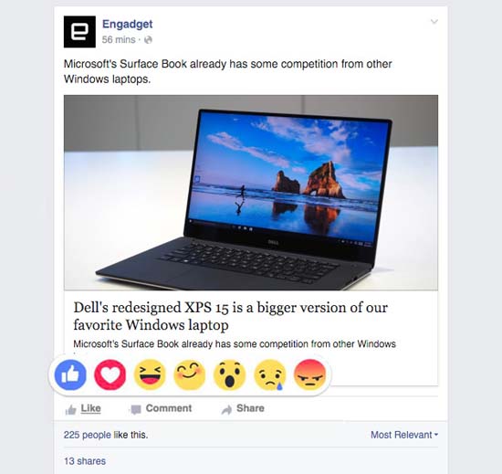 Журналистам Engadget стало известно, что Facebook собирается запустить «Реакции», которые позволят выражать больший спектр эмоций, которые вызывает то или иное сообщение пользователей. Среди эмоций, выражаемых привычными эмотиконами, появятся смех, удивление, печаль, гнев и т. д.