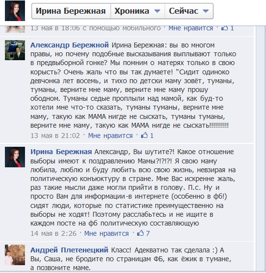 От странички Ирины Бережной веет женственностью, и, вместе с тем, желанием отстраниться от политических дискуссий. В основном, пани Ирина рассуждает о благотворительности, детях, счастье, вселенской любви, вере в светлое будущее. Но и тут «крепкий мужик» впиндюрил свои 5 копеек, как только чиновница решила поздравить матерей с их праздником: