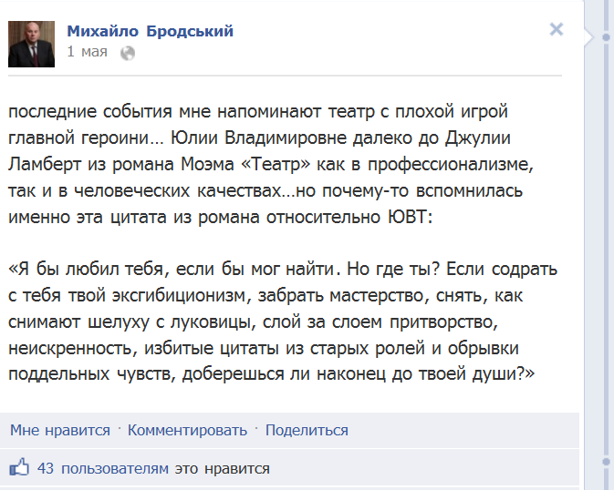 По мнению Михаила Бродского, очень активного отписчика на странице facebook, проблема у нас вообще только одна – умных мало. В этом месяце политик взывает всех жить дружно и в открытые политические «*рачи» не вступает.