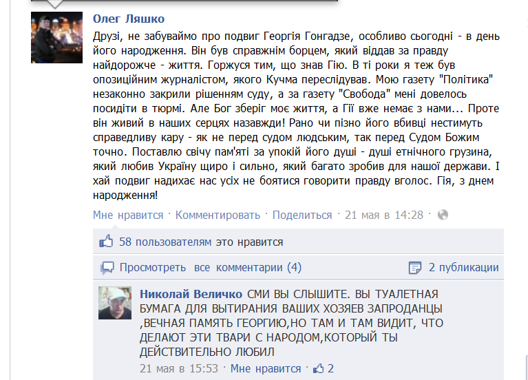 Аккаунт Олега Ляшка последний месяц (как и предыдущие) живёт обсиранием «ворогів-супостатів неньки України». 21 мая чиновник поздравляет Георгия Гонгадзе, который исчез при Кучме, с Днём рождения.