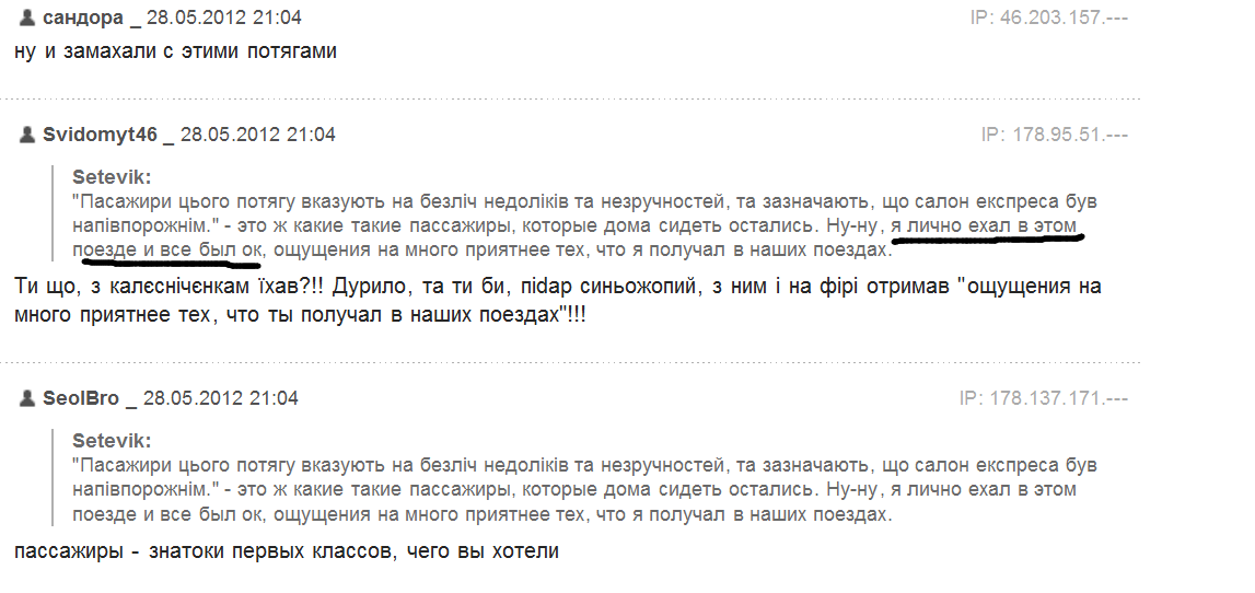 Когда читаешь отзывы к статье на сайте «УП», создаётся впечатление, что доселе все только первым классом и ездили. И тут якобы украинскому потребителю предложили какую-то тарантайку, по статусу смежную с региональной электричкой.