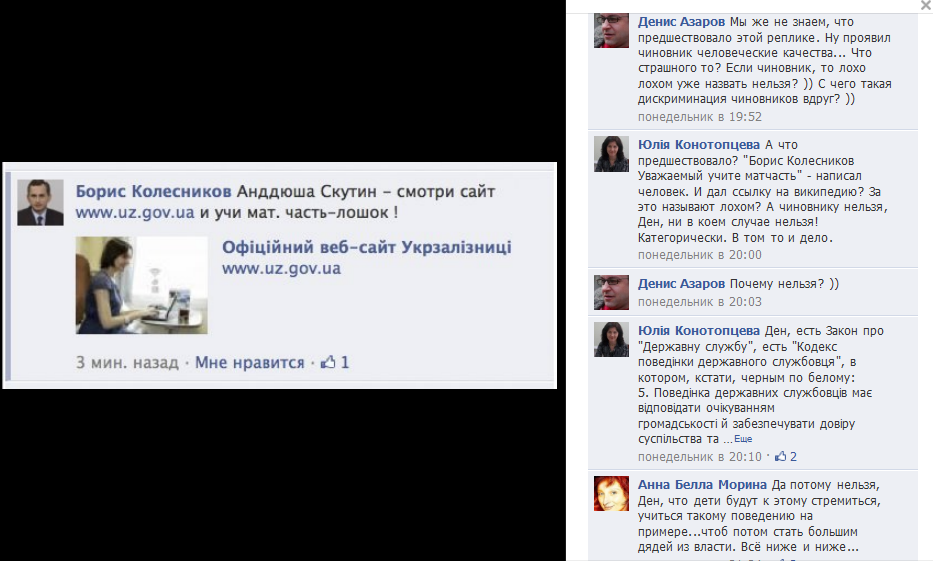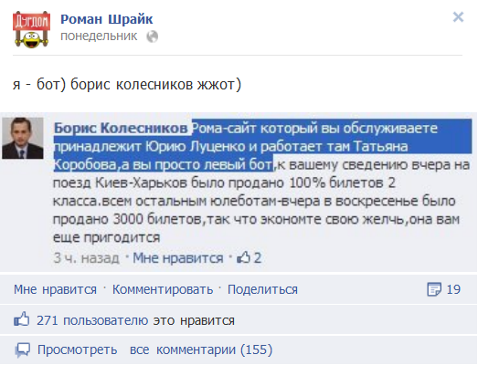 Наше издание мониторит новости в сети facebook. Нам интересно, чем живут политики, какие события из их жизни вызывают в обществе наибольший резонанс. На прошлой неделе одной из горячих тем для активных обсуждений и дебатов стал (якобы) «срыв» Бориса Колесникова на "дурдомовского" наёмника Романа Шрайка. Провокация рулит. Скандальчик (в предвыборной гонке за гонорарами) набирает обороты. Далее всё плавно переносится в фейсбук.