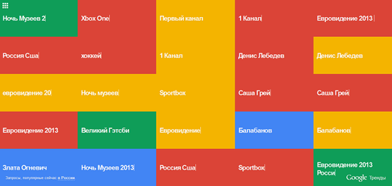 Google собирает информацию о том, какие поисковые запросы наиболее популярны, едва ли не со дня основания, а сегодня компания закатила специальной страничке, где они отображаются, большой редизайн – теперь их можно визуализировать. Вот, например, как это выглядит для американской аудитории, а вот – для российской.