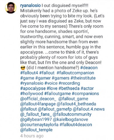 Ролевая игра Fallout 4 ещё не успела обзавестись полным набором дополнений, как первые слухи о пятой части уже просочились в сеть. Утечку информации произвёл актёр Райан Алосио, который озвучивал в Fallout 4 персонажа по имени Дьякон. Он опубликовал в Instagram фотоколлаж с персонажем Зиком из той же Fallout 4. Фанаты игры быстро указали актёру на его ошибку. Райан поспешил сменить коллаж, опубликовав сообщение с некоторыми пояснениями. Пост был удалён, однако подписчики Instagram-страницы Райана успели сделать скриншот.