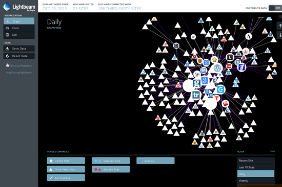 Lightbeam позволяет увидеть, какие веб-серверы обращались к компьютеру — в том числе и без ведома пользователя. Это могут быть, например, социальные сети, сервисы интернет-статистики и рекламные службы.