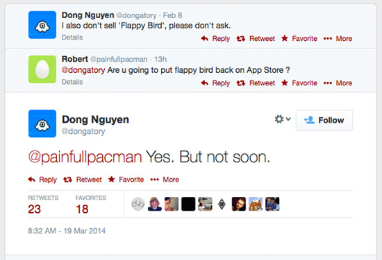 Но теперь, спустя месяц, Нгуен решил вернуть проект в магазины мобильных приложений. Об этом он написал в своем микроблоге. «Ты собираешься вернуть Flappy Bird в App Store?», – спросил Нгуена в твиттере один из его подписчиков. «Да. Но не скоро», – ответил он.