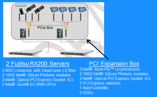 Продемонстрированное серверное решение использовало высокоскоростное волоконно-оптическое соединение для выноса за пределы серверов системы обработки и хранения данных. Внешний подключенный к серверам Primergy RX200 модуль расширения содержал массив из твердотельных накопителей и сопроцессоры Xeon Phi, которые в привычных конфигурациях устанавливаются в слоты внутри серверов.