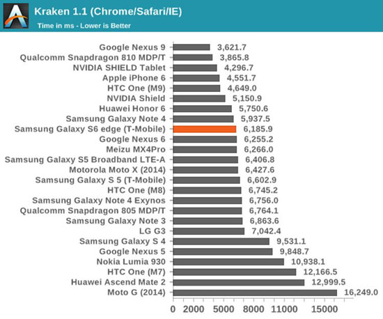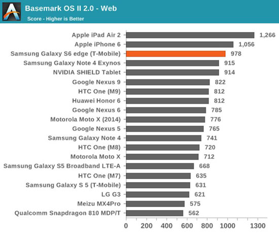 На этом браузерном тестировании Galaxy S6 Edge установил рекорд среди Android-девайсов, уступив лишь iPad Air 2, базирующемуся на чипсете A8X с тремя ядрами Enhanced Cyclone и графическим процессором GXA6850 GPU.