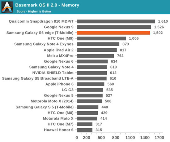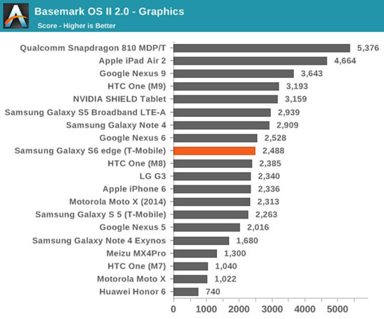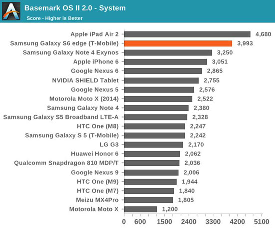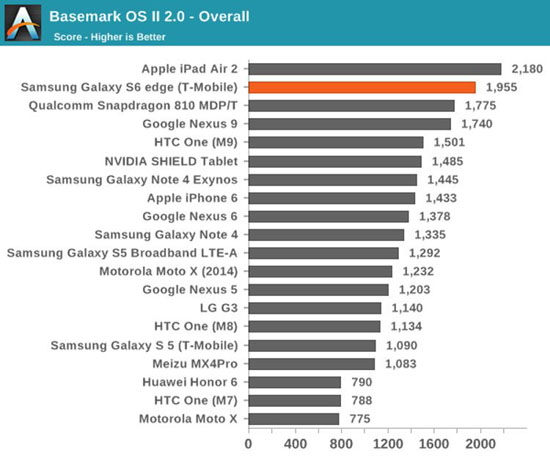 В этом тестировании Exynos 7420 и Snapdragon 810 проявили себя практически наравне. Родной браузер устройства часто показывает лучшие результаты, поскольку он оптимизирован производителем девайса. Проведено было также тестирование бенчмарком Basemark OS II 2.0, позволяющим составить более полную картину производительности процессора. Чем выше цифра в баллах — тем лучше показатель.