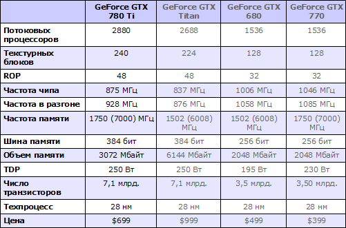 Новинка построена на базе того же чипа GK110, что и GeForce GTX Titan, но имеет полностью разблокированные вычислительные модули. Так GeForce GTX 780 Ti имеет 2880 потоковых процессоров, 240 текстурных блоков и 48 ROP. Его частота составляет 875/928 МГц, что также выше, чем у Titan. Кроме того, видеокарта обладает 3 Гбайтами памяти GDDR5, работающих на частоте 7 ГГц. Шина памяти — 384 бита. Новинка будет продаваться по цене $699.