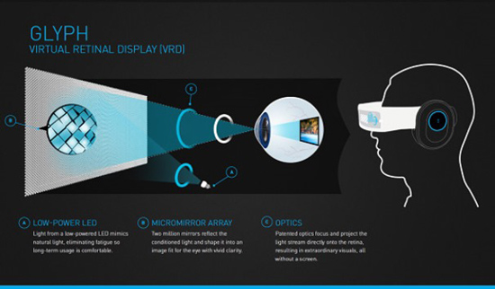 Выставив на площадке Kickstarter свой проект, компания Avegant сумела собрать необходимые $250 000 за считанные часы. Очевидно, аудитории очень приглянулся предлагаемый гаджет – персональная мультимедийная система Glyph. Центральная часть устройства – виртуальный ретина-монитор, проецирующий свет непосредственно в зрачок глаза. При этом создается полная иллюзия того, что видимое изображение находится рядом с самим человеком. Ничего общего с плоской картинкой на мониторе нет, свет направляется в оба глаза, поэтому все объекты кажутся такими же трехмерными, какими являются в реальном мире.