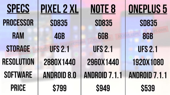 Перед началом следует заметить, что Google Pixel 2 XL оснащен процессором Snapdragon 835 с тактовой частотой 2,46 ГГц, 4 ГБ оперативной памяти и флеш-памятью UFS 2.1. Флагманский OnePlus 5 в топовой конфигурации оснащен точно таким же чипсетом и встроенной памятью, но 8 ГБ ОЗУ. В то же время, Samsung Galaxy Note 8 может похвастаться процессором Snapdragon 835 с тактовой частотой 2,36 ГГц и 6 ГБ оперативной памяти.