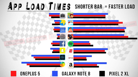 Поскольку сравнение происходило в США, то испытуемый смартфон Samsung Galaxy Note 8 оснащен процессором Snapdragon 835, поэтому российская версия этого флагмана на процессоре Exynos может показывать другие данные, но их быстродействие разнится не более чем на 10%. Для того чтобы определить, какой смартфон самый быстрый в реальной жизни, был проведен стандартный тест – на запуск приложений из флеш-памяти, а затем уже из оперативной памяти.