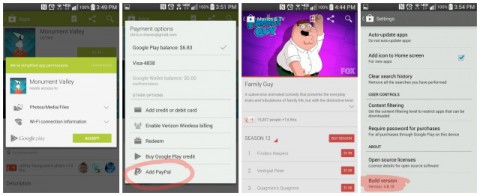 Компания Google выпустила обновление 4.8.19 для магазина приложений Google Play. В обновлении появилась поддержка платежной системы PayPal и некоторые незначительные изменения пользовательского интерфейса. Так, например, были убраны цветные полоски вкладок для музыки, фильмов и книг. Также изменению подверглось окно подтверждения скачивания и установки приложения. Оно было уменьшено до иконки и вмещает в себя только краткое описание. Для просмотра всей информации окно может быть расширено с помощью одного клика.