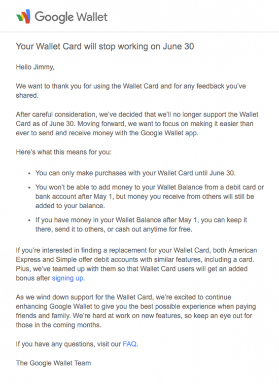 Корпорация Google заявила о том, что 30 июня она прекратит поддержку дебетовых карт Wallet Card. Такие карты, появившиеся в ноябре 2013 года, позволяют оплачивать покупки и услуги с помощью баланса Google Wallet в любом магазине, где принимают карты MasterCard. Также с таких карт можно снимать деньги через банкоматы. В электронных письмах, которые компания разослала владельцам Wallet Card, Google говорит, что хочет «сфокусироваться на том, чтобы отправлять и получать деньги через приложение Google Wallet было как никогда просто».