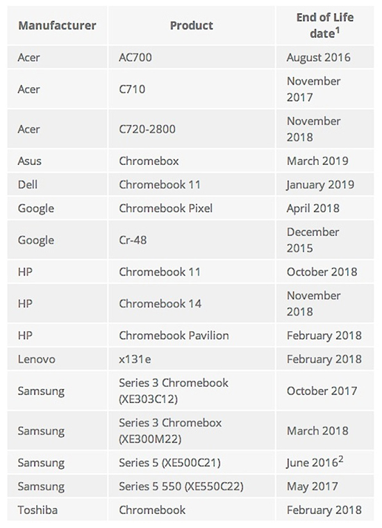 Также компания обнародовала список моделей хромбуков с датами истечения поддержки: