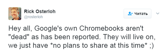 Сегодня, Рик Остерло, в своём Twitter-аккаунте сообщил, что линейка Chromebook Pixel не будет заброшена Google. Они продолжат существовать, но на данный момент у компании нет планов по дальнейшему развитию, которыми она могла бы поделиться с потребителями.