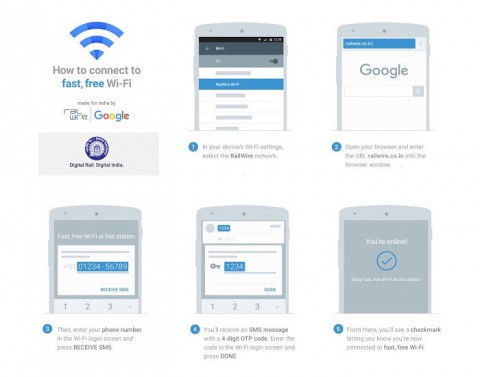 "Итак, если вы находитесь на Mumbai Central или, в ближайшем времени, на одной из четырех следующих станций, вам доступен высокоскоростной Wi-Fi, если в списке доступных сетей Wi-Fi на вашем устройстве будет "RailWire Wi-Fi". Если вы увидите такую сеть, то следуйте простым пунктам, чтобы получить доступ к Интернету на телефоне и двух дополнительных устройствах, таких как ноутбук или планшет. Для этого нужно иметь индийский номер телефона, чтобы получить код доступа", - объясняет Google.