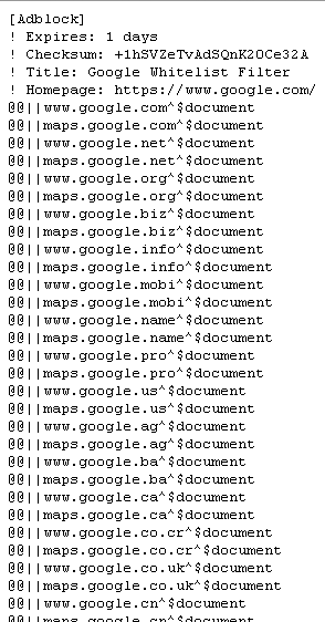 Сообщение ссылается на специальный фильтр для AdBlock Plus, который находится на сайте Google. В фильтре под названием Google Whitelist перечислены сотни сайтов Google во всех доменных зонах. После его установки блокировка рекламы с этих сайтов снимается.