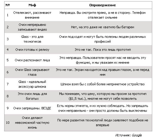 Google опубликовала список из 10 наиболее популярных мифов об очках дополненной реальности Google Glass, дополнив каждый из них опровержением.