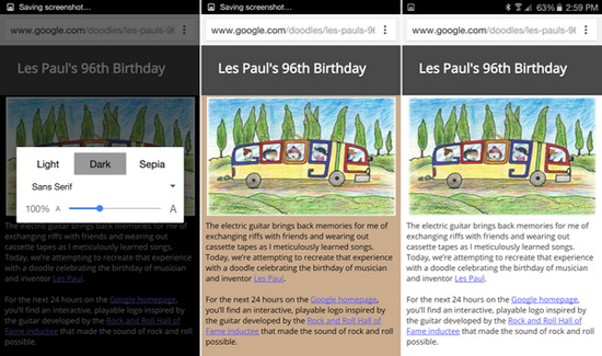 Также, как у Safari в iOS 9 разработчиками Google предусмотрена возможность выбора шрифта, изменения размера текста и цвета фона страницы (светлый, темный и сепия). Режим чтения также доступен в последней бета-версии Chrome.