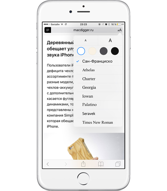 Порой при чтении сайтов в Интернете пользователи испытывают дискомфорт, вызванный мелким шрифтом, плохой версткой страницы или пестрящей рекламой, заполонившей дисплей смартфона. В таких неудобных случаях на помощь приходит кнопка «Reader», расположенная в адресной строке Safari. Если нажать на нее, интернет-страница обретает новый аккуратный вид. Впервые режим чтения в Safari появился в iOS 5, а в iOS 9 его можно настраивать по своему усмотрению – выбирать цвет фона и менять шрифт в статье.