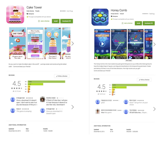 Третье пришествие Brain Test снова обнаружили сотрудники Lookout. В блоге исследователи пишут, что раньше троян просто стремился установить на пораженный смартфон сторонние приложения, без ведома жертвы. Эти дополнительные приложения вовсе необязательно были вредоносными: прибыль авторы малвари получали от «продвижения» таких программ, то есть за сам факт их установки. Теперь создатели вредоноса научили свое детище новым трюкам. В частности, новый Brain Test оставляет поддельные положительные отзывы другим зараженным приложениям в магазине, чтобы помочь им набрать хорошую репутацию.