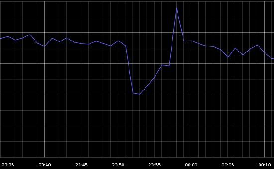 Система сбора данных с веб-счетчиков GoSquared показывает провал посещаемости всех сайтов в интернете на 40% в промежутке примерно между 03:52 и 03:54 по московскому времени (на графике показано время по Гринвичу).