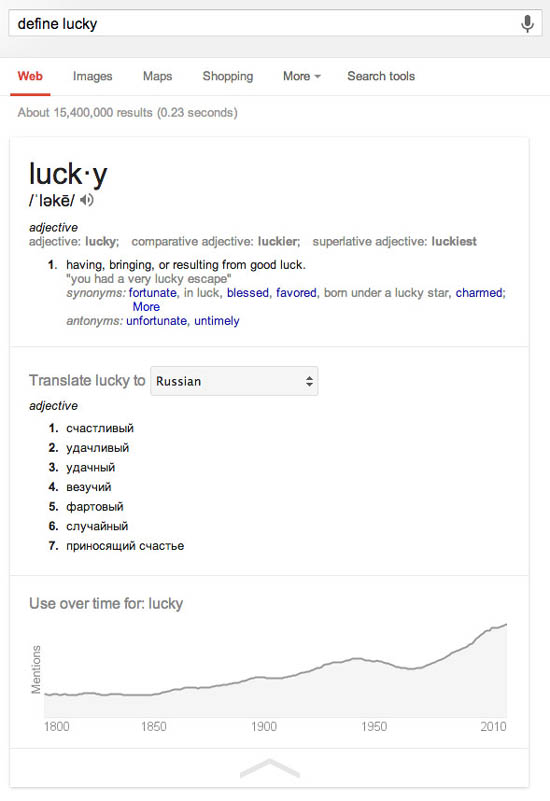 Теперь же Google решила пойти дальше, и постараться полностью заменить пользователям толковый словарь. Пока что функция доступна, судя по всему, лишь для англоязычных запросов, в начале которых нужно поставить слово "define" ("определить"):