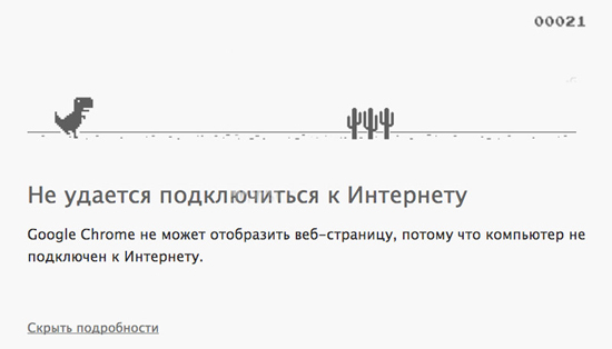 Затем необходимо запустить Google 39 и перейти на любой ресурс или попробовать задать поисковый запрос. Браузер покажет страницу, сообщающую о том, программе не удается подключиться к Интернету. В верхней части браузера пользователь увидит одиноко стоящего грустного динозавра.