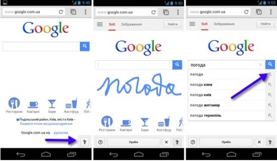 После включения рукописного поиска в настройках, появится новый значок в правом нижнем углу главной страницы Google и на страницах результатов поиска Google. Достаточно коснуться его и написать несколько букв в любой точке экрана, чтобы вывести варианты автозаполнения, которые отобразятся под окном поиска. Клик на подходящий вариант запустит поиск. При вводе длинного поискового запроса стрелки рядом с подсказками позволят перемещать нужные варианты в поле поиска.