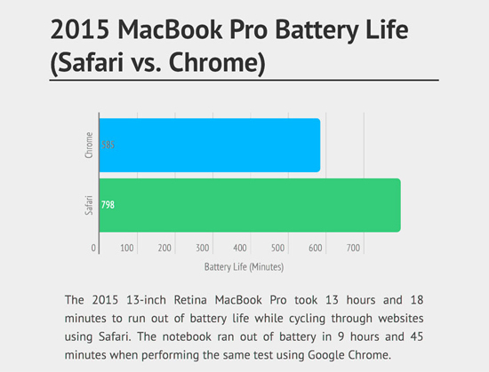 Согласно недавнему тестированию Google Chrome на предмет того, какое влияние на «автономность» лэптопа оказывает программа, настольный обозреватель сокращает время работы MacBook почти на четыре с половиной часа. Если при использовании стандартного браузера Safari компьютер проработал 13 часов и 18 минут, то веб-серфинг в Google Chrome сократил этот показатель до 9 часов и 45 минут.