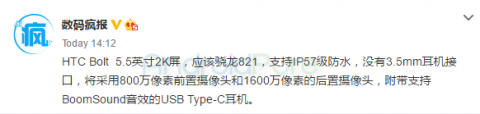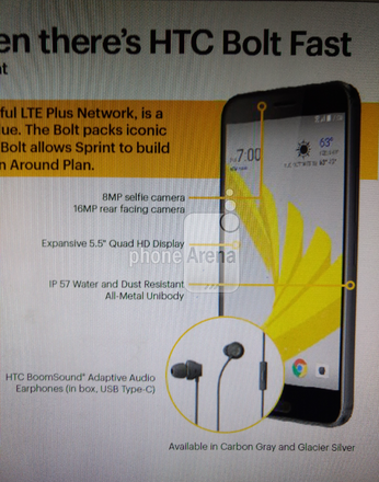 Также стало известно, что в комплекте со смартфоном будут поставляться наушники BoomSound Adaptive Audio, подключаемые по USB Type-C. Напомним, что в аппарате не будет 3,5-мм аудиоразъёма. Кроме этого, другой источник опубликовал информацию о том, что HTC Bolt получит флагманский процессор Qualcomm Snapdragon 821, а не Snapdragon 810, как считалось ранее. "Из" коробки заявлена операционная система Android 7.0 Nougat.