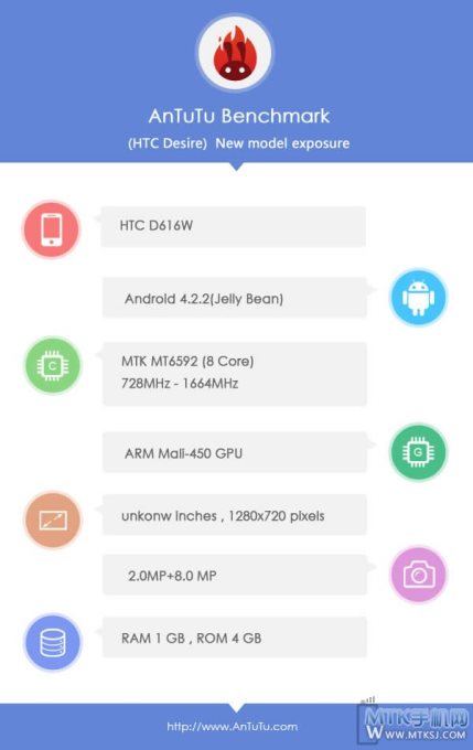 HTC на официальном уровне расставила приоритеты в пользу среднего ценового сегмента на текущий год. В подтверждение этого тезиса, похоже, компания готовится представить смартфон на необычной для себя платформе от соотечественников из MediaTek. В базе AnTuTu были найдены сведения о смартфоне HTC D616W, который имеет «под капотом» популярный «честный» восьмиядерный чипсет MT6592 с тактовой частотой 1,7 ГГц и графическим ускорителем Mali-450. Помимо этого, девайс получит дисплей неизвестного размера с разрешением 1280 х 720 точек, 1 ГБ ОЗУ, 4 ГБ ПЗУ, 8-Мп и 2-Мп камеры, а также Android 4.2.2 Jelly Bean.