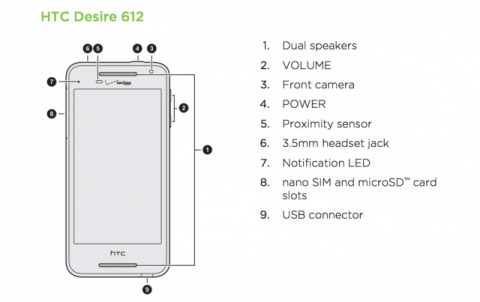 HTC Desire 612 получит фронтальные стереодинамики, раздельные кнопки регулировки громкости, две камеры, физическую кнопку включения, сенсор приближения, аудиоразъём 3,5 мм, LED-индикатор для уведомлений, слоты для nano-SIM и microSD, а также USB-порт.