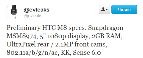 mike1986 с XDA, не менее именитая личность, подтверждает размер и разрешение дисплея, а вот по процессору у него иные данные — свежайший Qualcomm Snapdragon 805. Он же называет и имя флагмана тайваньцев на 2014 год — HTC One+. По информации разработчика, в смартфоне действительно установят 2 ГБ оперативной памяти, но это будет скоростная LPDDR3. Подтверждает он и спецификации камеры, уточняя, что UltraPixel-модуль будет обладать матрицей с более высоким разрешением (6 Мп или 8 Мп) и сразу двумя различными линзами для улучшения качества съемки в зависимости от условий.