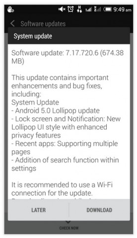 Смартфон HTC One (M7) с двумя SIM-картами, который был выпущен ещё в августе 2013 года, начал получать обновление до Android Lollipop. На данный момент не установлено, актуально ли развёртывание обновления для какого-нибудь отдельного региона, или же новую версию прошивки получат владельцы устройства во всём мире. Размер обновления составляет около 675 МБ, после завершения процедуры обновления версия прошивки получит индекс 7.117.720.6. Нынешнее обновление выпускается спустя неделю после того, как HTC объявила, что One Mini, равно как и One Mini 2, не получат Lollipop.