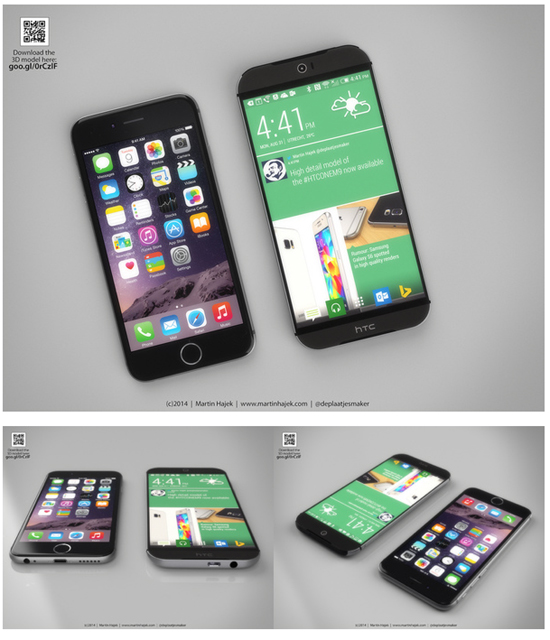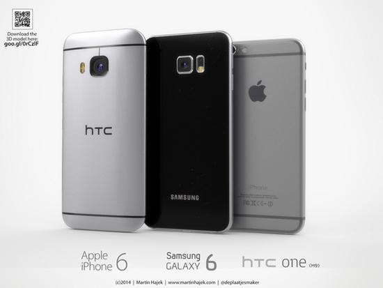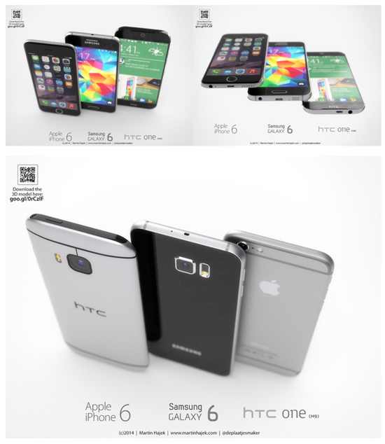 Официально флагманы HTC One (M9) и Galaxy S6 еще не представлены, однако об их внешнем виде уже вполне можно судить по недавним концептам, воссозданным на основе свежих утечек и слухов. Дизайнер Мартин Хайек (Martin Hajek) объединил визуализации обеих моделей с iPhone 6 и представил наглядное сравнение всех устройств.