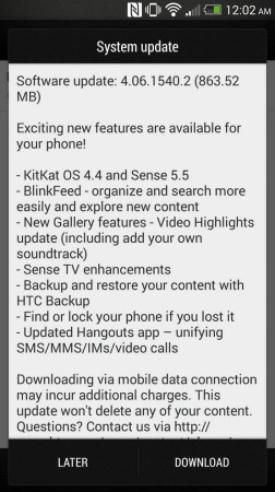 Для тех, кто не следит за столь редкими вариантами One, стоит упомянуть, что Developer Edition пару месяцев назад получил лишь Android 4.3, а версия Sense с номером 5.5 на него так и не пришла. В этот раз производитель исправил недоразумение и вместе с 4.06.1540.2 доставил на устройство свежую оболочку. Возможно, именно по этой причине OTA-пакет и имеет столь чудовищный размер — 863.52 МБ. То есть даже при наличии безлимитного тарифа на трафик от оператора и подключения к LTE загружать обновление лучше через бесплатную сеть Wi-Fi.