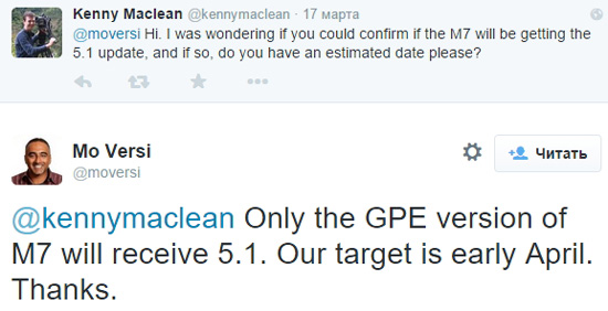 В дальнейшей беседе Мохаммеда Верси с одним из читателей выяснилось, что Android 5.1 для обычных версий HTC One M7 не планируется. Эта фраза лишь подтвердила январскую утечку, опубликованную независимым разработчиком LlabTooFeR. Учитывая наличие всех драйверов и подготовку аналогичной прошивки для GPE-версии смартфона, отказ от Android 5.1 для обычных One 2013 года — решение чисто идеологическое.