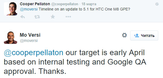 Менеджер по продукту американского подразделения HTC Мохаммед Верси (Mohammed Versi) сообщил, что компания планирует обновить One M7 и One M8 Google Play Edition до Android 5.1. Если в ближайшее время Google не выпустит какие-то серьезные патчи, то доработанный Lollipop попадет на эти смартфоны уже в начале апреля.