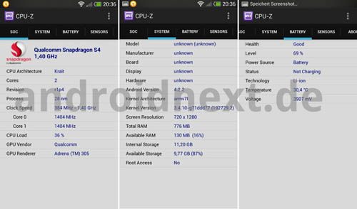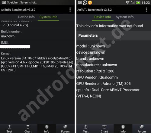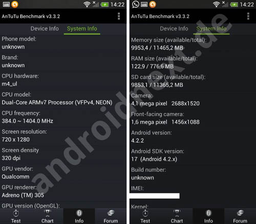 В частности, из них понятно, что HTC One Mini основан на чипсете Snapdragon 400 с 2-ядерным процессором с тактовой частотой 1,4 ГГц и графикой Adreno 305. В аппарате установлены 1 ГБ оперативной памяти, 4,3-дюймовый сенсорный дисплей с разрешением 720 х 1280 точек, основная 4,1МР камера UltraPixel, фронтальная 1,6МР камера и 16 ГБ встроенной памяти. В качестве операционной системы в нём используется Android 4.2.2.